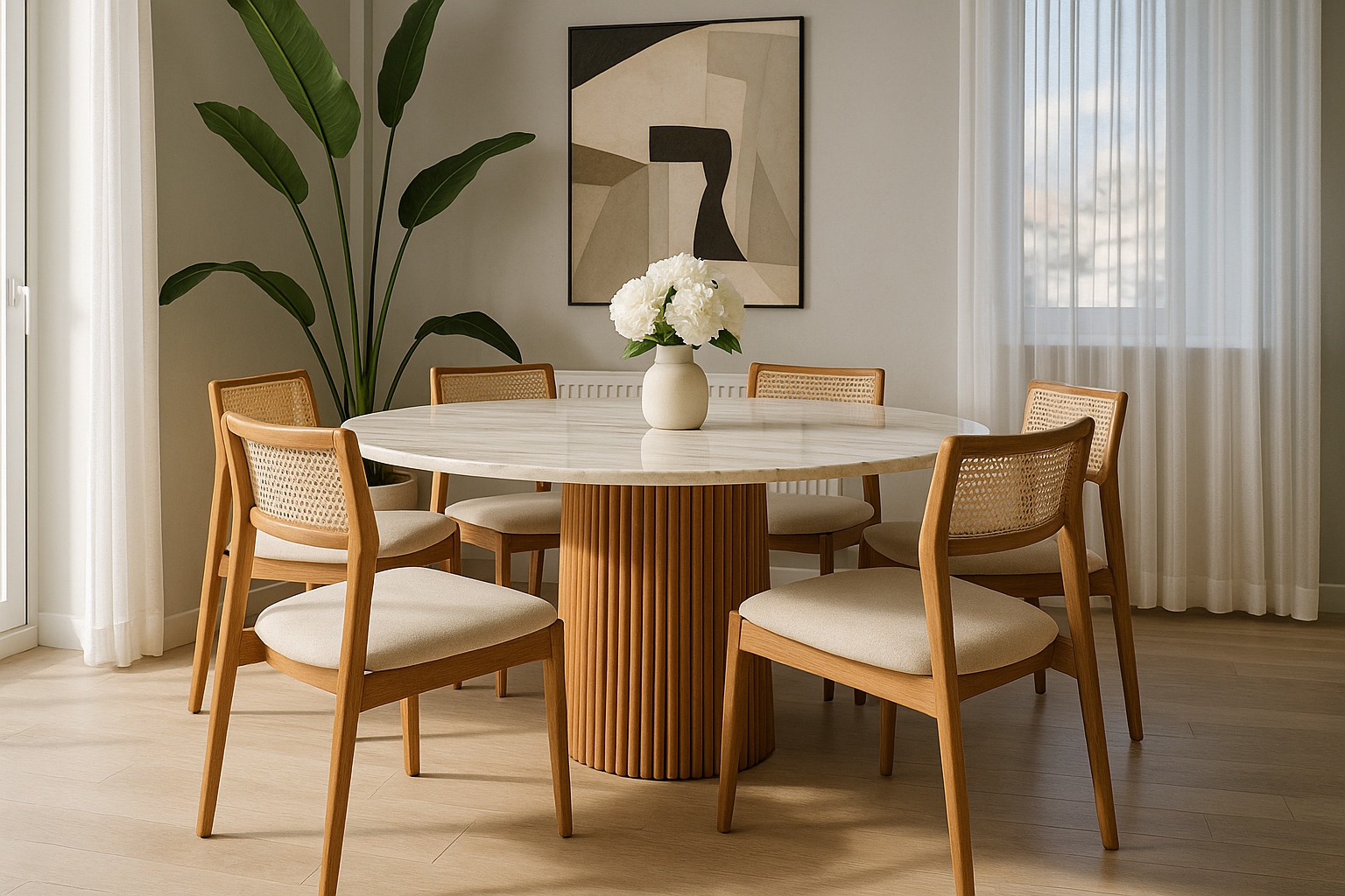 El Comedor Elysia es una declaración de estilo y equilibrio perfecto entre lo moderno y lo orgánico. Su mesa ovalada con cubierta en mármol blanco y base en madera estructurada aporta una presencia elegante y serena, creando un ambiente sofisticado y acogedor al mismo tiempo.