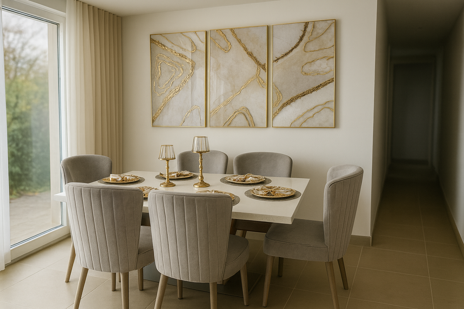 Las sillas tapizadas en terciopelo gris perla aportan comodidad envolvente y un toque refinado que convierte cada comida en una experiencia especial. La armonĆa de los tonos neutros y los detalles dorados crean un espacio que equilibra lujo y calidez, ideal para quienes aman el diseƱo atemporal con acentos modernos.
